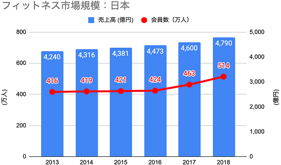 日本では、国民の4%に当たる514万人にとどまっていますが日本におけるフィットネス市場規模は、まだまだ伸びしろがあると言えます。