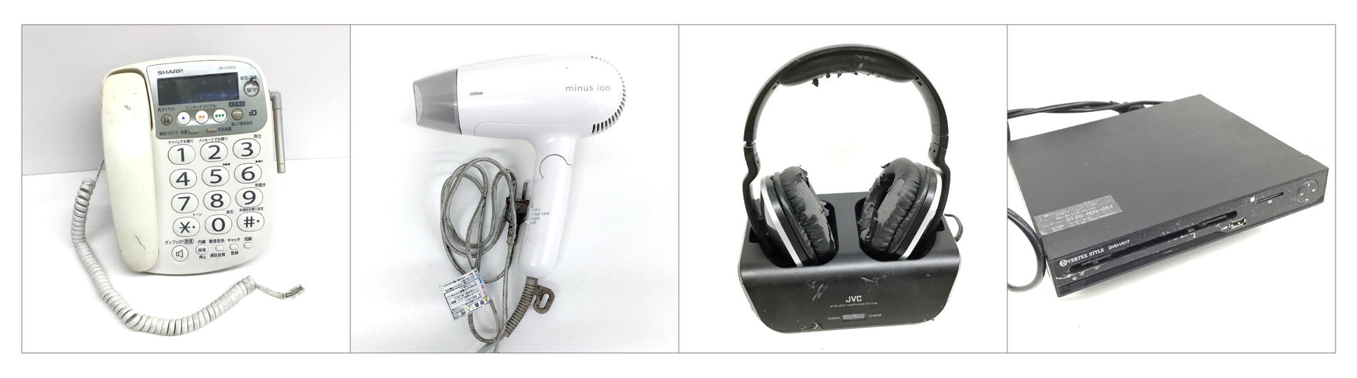 例えば、本体焼けの電話機。本体とコードが汚れたドライヤー。